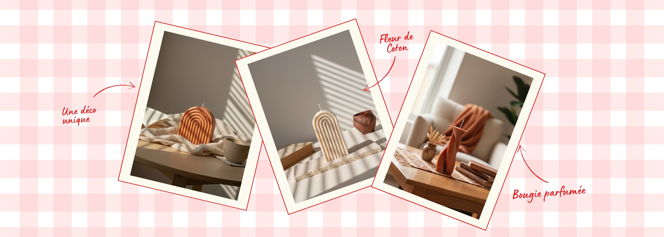 Vous y trouverez nos collections de bijoux à personnaliser, grâce à nos créoles interchangeables, des formes uniques le tout dans un univers très coloré et pailleté ainsi nos jolies pièces décoratives avec nos bougies parfumées.